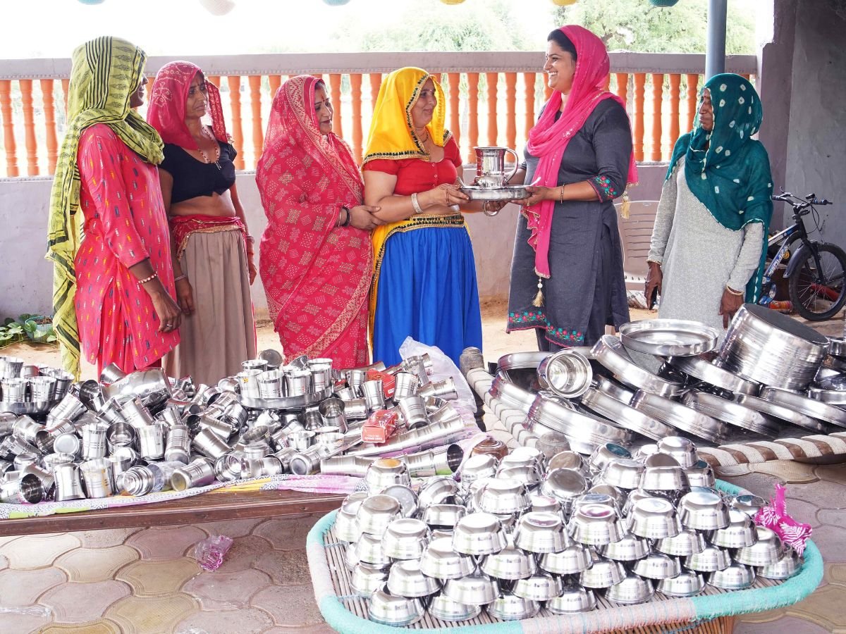 Hockey Wali Sarpanch Neeru Yadav handing over Utensils under Bartan Bank initiative